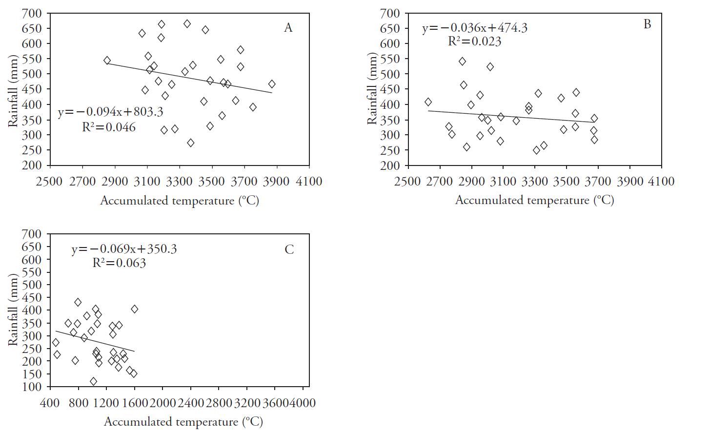El calentamiento global tiene efecto importante en la precipitación (Piao et al., 2010). Los hallazgos de García-Páez y Cruz-Medina (2009) indican que la escasez de agua en regiones de México puede empeorar por la variabilidad de las precipitaciones debido al cambio climático. Las precipitaciones en Pingliang, Yulin y Huhehot mostraron una tendencia de variación con aumento de la temperatura acumulada (Figura 2), y las precipitaciones en estos lugares disminuyeron 75.0, 84.3 y 162.5 mm. Las precipitaciones medias anuales se redujeron 2.50, 2.81 y 5.42 mm en Pingliang, Yulin y Huhehot. El aumento de la temperatura acumulada puede resultar en pérdidas graves de precipitación, que perjudicarían la producción agrícola en regiones semiáridas y áridas (Wang, 2009).