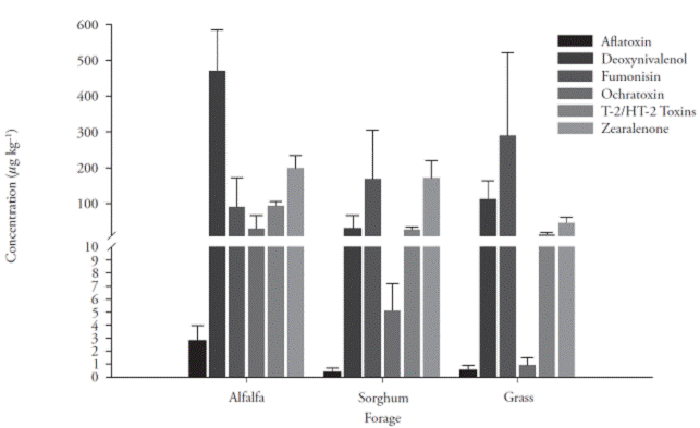 Maíz, trigo, cebada, arroz, avena, mijo y sorgo se pueden contaminar con zearalenona (Zain, 2011), mientras que la contaminación por toxinas T-2/ HT-2 es rara en trigo y maíz. Pero en nuestro estudio se detectaron toxinas T-2/HT-2 y zearalenona en todas las muestras analizadas de alfalfa, sorgo y zacate (Tabla 1).