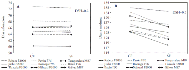 Figure 1 Behavior of A) Days to flowering and B) Days maturity, in terms of the application of fungicides in bread wheat under rainfed conditions. CF and SF: with and without fungicide application, respectively. HSD: honest significant difference.
