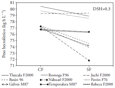 | Tlaxcala F2000 | 79.6 a | 10.2 a | 494.6 a | 1.1 cb | 801.2 bac |