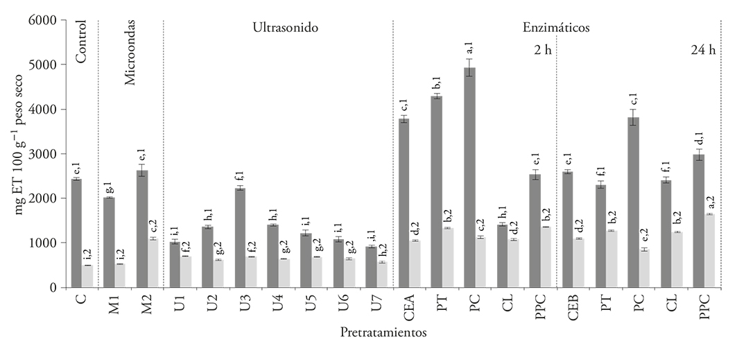 ) extracts obtained after applying pretreatments: microwaves (M), ultrasound (U), protease (PT), pectinase (PC), cellulase (CL) and enzyme mixture (PPC). All compared with controls without treatment (C, CEA, CEB). Numbers indicate a significant difference between the samples; letters indicate a significant difference between pretreatments (p≤0.05).