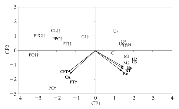 Figure 4 Two-dimensional chart of PC1 and PC2 principal components for the PCA charges and scores for Bc, Bx, TB, TPC, and AC obtained in seedless pulp without (C) and with microwave (M), ultrasound (U) pretreatment and with protease (PT), pectinase (PC), cellulase (CL), protease, pectinase and cellulase (PPC) enzymes after 2(†) and 24 (††) h of incubation.