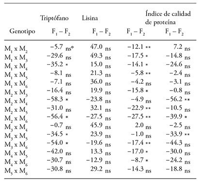 The crosses M2 x M4, M2 x M6 and M3 x M6 mentioned above as outstanding for their high significant levels of Trp, Lys, TP and ICP had reduced responses because of inbreeding depression. The exception was M3 x M6 which maintained its ICP with no changes in F2. This cross was the best of the study because it showed high significant values in quality protein in F1 and did not exhibit significant inbreeding depression.