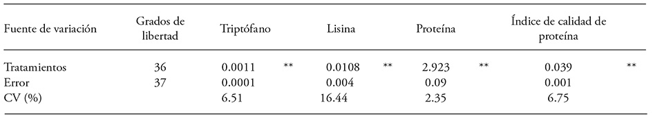 With the data, an ANOVA was performed. Lysine, Trp and protein contents, and the ICP, between and within genotypes, were compared using the Tukey test (p≤0.05). To evaluate quality protein stability of each cross between their F1 and F2 generations (inbreeding depression), the t test for paired data was used (p≤0.05). All the statistical analyses were carried out with SAS software (SAS Institute, ver. 9.2).