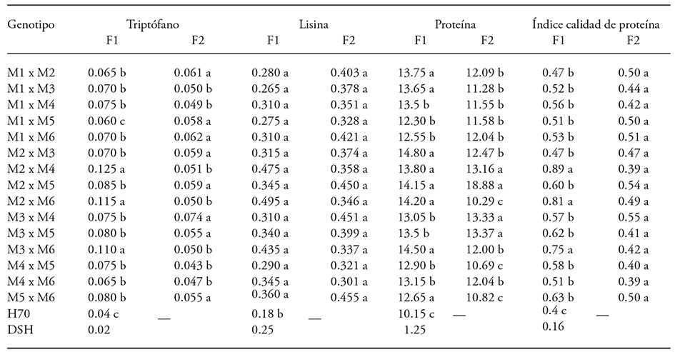 Differences (p≤0.01) were found in Trp, Lys, and ICP for F1 and F2 lines and crosses and the regional control (H70) (Table 2). Thus, the genotypes expressed significant variation in the quantified characteristics of protein quality and, therefore, the means obtained in each case were compared (Table 3).