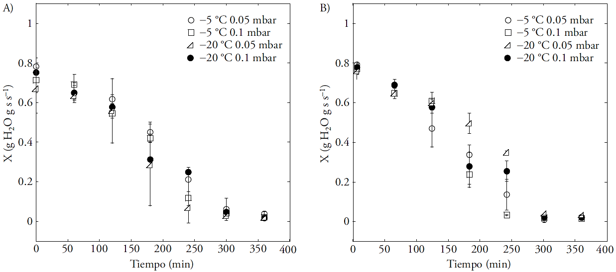 Moisture decreased in yellow plum (Figure 1B) after 60 min, under all conditions evaluated; however, with 0.1 mbar and freezing at -5 °C, moisture stabilized at 240 min; finally, at 300 min, it stabilized in the other treatments. In all the treatments, there were two acceleration and deceleration periods of moisture loss. Pei et al. (2014) noted that the acceleration period may be attributed to the greater sublimation area during the first stage of drying, and that it is gradually reduced as the process continues, because it increases the mass-transfer resistance. The effect of freezing temperature in the final moisture of the slices was not significant. However, slow freezing caused rapid sublimation of yellow plums, probably because the ice crystals were larger compared to fast freezing. These results are similar to those reported by Reyes et al. (2011) and Ceballos et al. (2012) in apple and soursop slices, respectively. These authors found that small pores generated narrow roads with greater resistance to water flow.