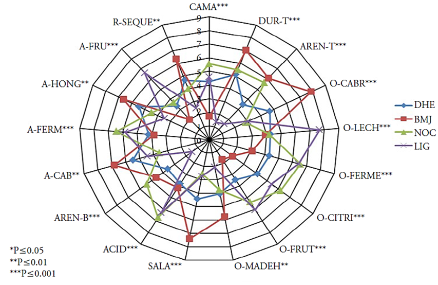 NOC cheese had higher (p£0.05) intensity CAMA, O-CITRI, ACID and A-FERM.BMJ cheese was perceived (p£0.05) as DUR-T, AREN-T, O-CAB, O-MADEH, SALA, A-CAB, A-HONG and R-SEQU, LIG cheese was characterized (p£0.05) by the attributes O-LECH, O-FRU and A-FRU, while DHE cheese had intermediate intensities in all the attributes (Figure 1).