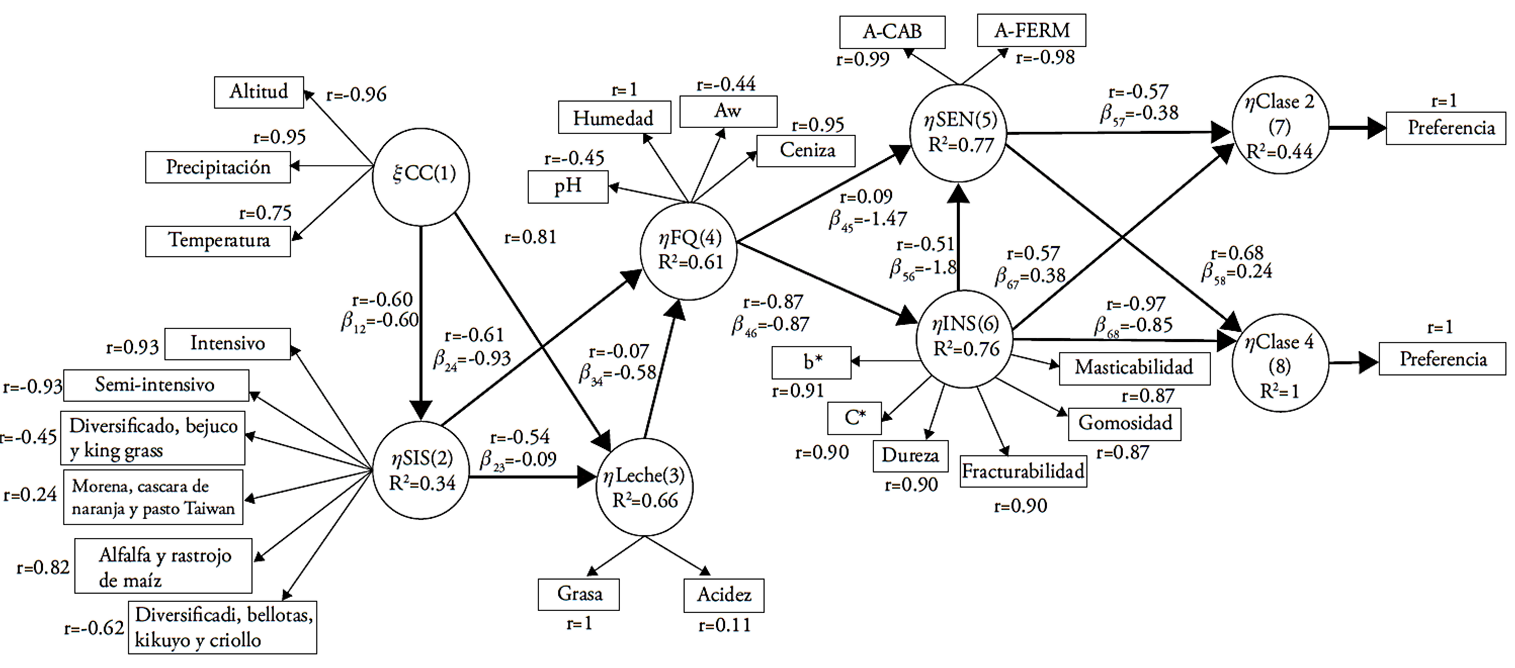 The local demand for aged cheeses is high, although they lack a commercial brand name that protects and valuates them (Villegas de Gante, 2009). For this reason and to generate information for the producers, this food should by typed integrally, considering the effect of climate, management and feeding, and the raw material (milk) on cheese quality and consumer preferences (Brunschwig et al., 2004; Bergamaschi et al., 2015). The multivariable regression method of partial least squares path modeling (PLS-path modeling) is an option for analyzing and schematically representing artisan cheese typing (Tenenhaus et al., 2005). However, it has not been applied to Mexican artisan cheeses.