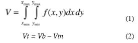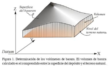 Los volúmenes de las superficies del depósito de basura y del terreno natural, se calcularon con respecto a un datum o nivel de referencia (Figura 1), a través de la doble integral (ec. 1) de la función definida por el respectivo MDT. El valor de dicha integral o volumen, se obtuvo del promedio de resultados obtenidos con las tres siguientes reglas de aplicación múltiple: trapezoidal, Simpson 1/3 y Simpson 3/8 (Press et al., 1988). El volumen total se extrajo de la diferencia de ambos volúmenes (ec. 2). Todo lo anterior, fue calculado a través de los respectivos comandos del programa SURFER 8.