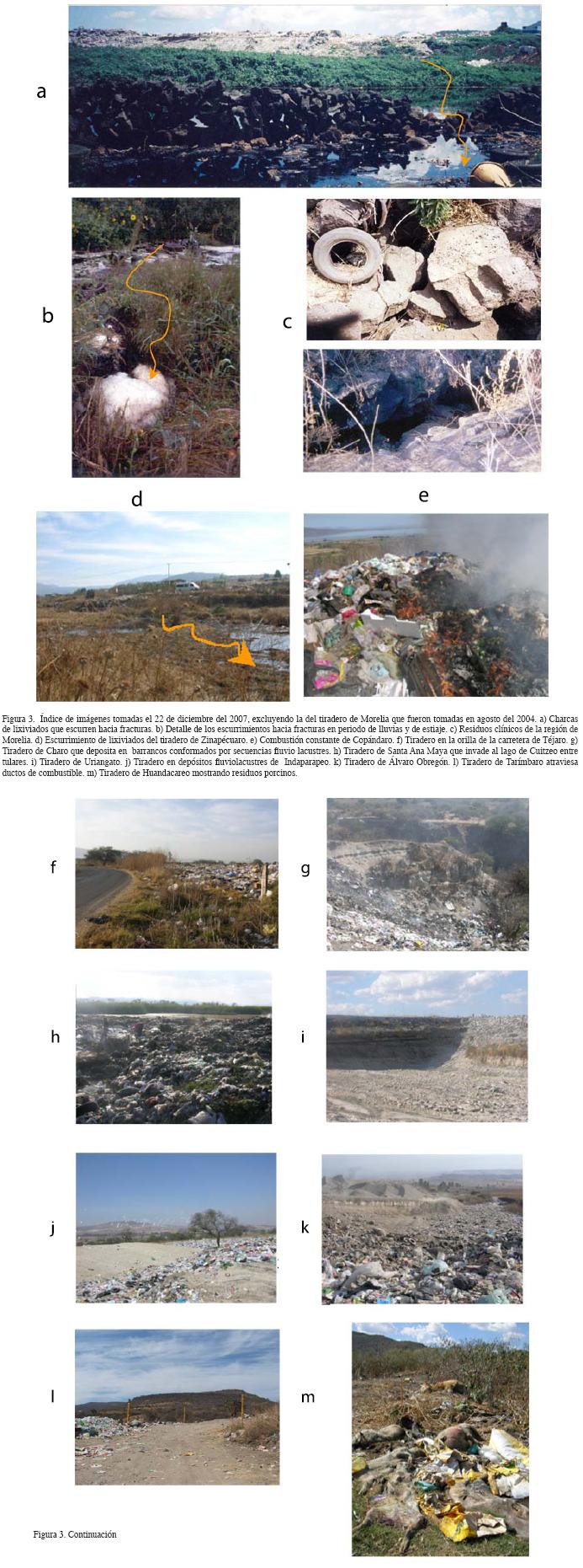 En todos los tiraderos es común la proliferación de fauna indeseable y emisión de gases, en ocasiones tóxicos, como metano y lixina generados en las 34 hectáreas del tiradero de Morelia. Dicho tiradero funcionó en el mismo punto desde 1984 hasta el 2007, y sus residuos están en proceso de compactación. Durante la incineración de residuos, se producen además malos olores y dispersión de partículas a través de la acción eólica. Tal es el caso del tiradero de Copándaro que se encuentra en combustión continua (Figura 3e). También, se detectaron tiraderos clandestinos en las márgenes de las carreteras (Zinapécuaro y Téjaro, Figura 3f), en brechas, y en zonas de cárcavas y cañadas que presentan marcada erosión (Charo, Figura 3g).