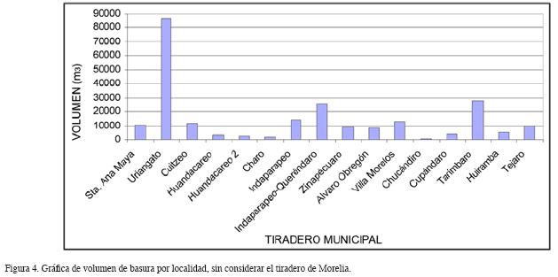 En el estudio de los volúmenes de basura depositados en los distintos sectores de la cuenca (Tabla 1, Figuras 4 y 5), resalta que los municipios que más residuos sólidos producen son aquellos en donde se encuentra la densidad demográfica más alta. Por ejemplo, en la región de Morelia la generación diaria es de 700 toneladas, conformando un volumen aproximado de 2,400,000 m3 de residuos. Esa área concentra cerca del 85% de los residuos sólidos de la cuenca, e integra un 72% de las fuentes residenciales, el 83% de actividades industriales, 82% del ramo comercial, el 90% corresponde a fuentes especiales, institucionales y de servicios, y alrededor del 74% proviene de actividades de construcción (Buenrostro e Israde, 2003). Le sigue el municipio de Uriangato con 87,000 m3 (Figura 4, Tabla 1). Estos volúmenes varían considerablemente, ya que se ha hecho común el proceso de incineración de residuos. El mayor porcentaje de materiales que son incinerados son plásticos, con el fin de maximizar el aprovechamiento del tiradero.