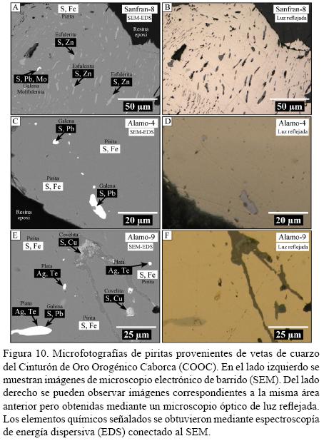 Los estudios de microscopía electrónica de barrido con detector de espectroscopía de rayos × de energía dispersiva (SEMEDS, por sus siglas en inglés) se realizaron en granos milimétricos de pirita, oro y galena de algunas muestras de vetas de cuarzo del Cinturón de Oro Orogénico Caborca (COOC). El procedimiento consistió en la elaboración de probetas de resina epóxica, montando cristales de pirita y galena de algunas de las muestras estudiadas en cinta doble cara, para posteriormente verter la resina epóxica en un molde y capturar los granos. Después del endurecimiento de las probetas se desbastó y pulió hasta llegar aproximadamente a la mitad de los granos para obtener un área máxima de exposición de los mismos. Por otro lado, los granos de oro de las muestras observadas se adhirieron con pintura de carbón conductora de electrones en unas pequeñas pastillas metálicas que sirven para su transporte y análisis dentro del SEM.