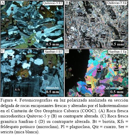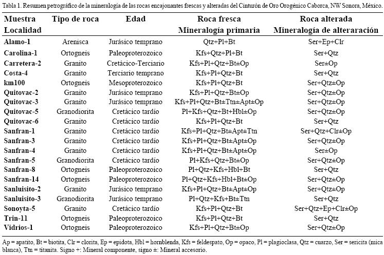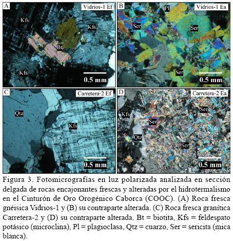 Mediante un estudio petrográfico de las 20 muestras de roca encajonante fresca y alterada se detectó que la alteración cuarzosericítica que solo se observa en algunas de las muestras megascópicamente, en el campo, se encuentra presente microscópicamente en la totalidad de las rocas estudiadas (Tabla 1 y Figuras 2, 3, 4). Algunos ejemplos de los minerales de alteración hidrotermal (sericita, cuarzo, epidota, clorita y minerales opacos) se pueden apreciar en las fotografías de las figuras antes mencionadas. Así mismo, se pueden ver los fantasmas o relictos de mineral desaparecidos asociados a la pérdida (destrucción), principalmente de los minerales ferromagnesianos y plagioclasas en los ejemplares de roca alterada. Esta alteración no es propiamente homogénea ya que se observan, en la mayoría de las muestras, parches de sericita y mosaicos de cuarzo. En la Tabla 1 se presenta un resumen de la mineralogía primaria en la roca fresca (original) y de la mineralogía de alteración presente en la roca alterada como resultado del hidrotermalismo. También se señala una clasificación litológica general y la edad del protolito definida a partir de estudios geocronológicos y de correlaciones con otras rocas similares fechadas en otros lugares del NW de Sonora.