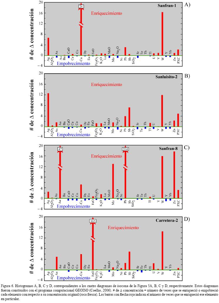 Los resultados de balance de masa indican que la muestra original (fresca) de la localidad Sanfran1 tuvo una pérdida de masa de 21.3 % en la zona alterada (Tabla A3 del Apéndice A). El óxido mayor K2O en la muestra Sanfran1 se enriqueció y los fluidos incorporaron ~2.48 % de K2O, lo que representa un incremento de ~0.87 veces o ~87 % su concentración con respecto al contenido en la roca fresca original (Tabla A3 del Apéndice A). El elemento Cu también fue enriquecido en ~621 ppm, lo que representa ~26 veces la concentración original de la roca fresca (Figura 6A). En contrapartida, el óxido mayor CaO se empobreció en 2.37 %, lo que representa casi el doble (~91 %) del CaO presente en la roca original. El elemento Y se empobreció en 2.38 ppm representando un poco más de la mitad (~54 %) del contenido inicial en la roca fresca. Por otro lado, la inmovilidad geoquímica para los elementos inertes es expresada como cero (Tabla A3 del Apéndice A). Sin embargo, en algunos elementos (p.e., Os) puede que esta inmovilidad no sea representativa porque podría ser el resultado de la falta de precisión en las técnicas analíticas empleadas en su cuantificación. De esta manera, y sucesivamente, el empobrecimiento, enriquecimiento e inmovilidad se pueden leer con el resto de los elementos presentados en la Tabla A3 del Apéndice A.