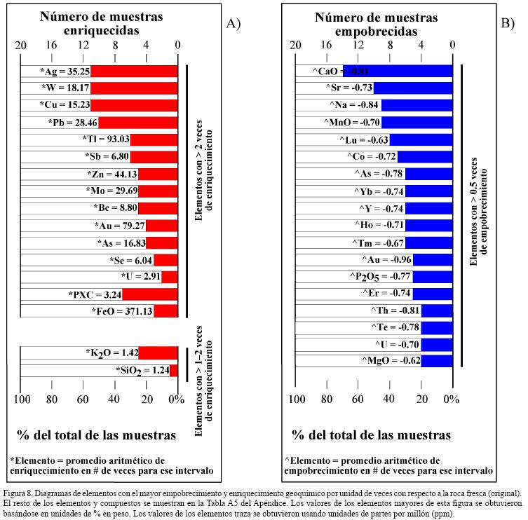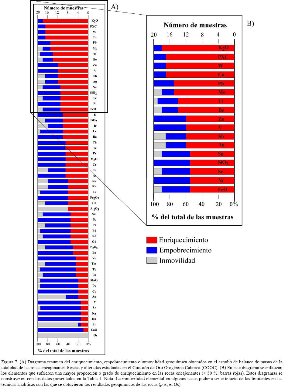 Por su parte, en la Tabla 2 y Figura 7A se presenta un resumen de la totalidad de las muestras analizadas mediante este estudio geoquímico de balance de masas con un recuento semicuantitativo de la proporción de enriquecimiento, empobrecimiento e inmovilidad elemental. Estos conceptos indican qué elementos han sido modificados o han permanecido sin cambios en sus concentraciones de la roca fresca (original) con respecto a la roca alterada. Los elementos y compuestos con una proporción de enriquecimiento > 50 % de la totalidad de las muestras, o mayormente enriquecidos en las rocas encajonantes alteradas, son el K2O, W, Cu, Pb, Mo, Tl, Be, Zn, V, Sb, Ag, Sn, SiO2, Se, Ni y FeO, y la pérdida por calcinación. Igualmente, los elementos con una proporción de empobrecimiento > 60 % en las rocas encajonantes alteradas son el Ca, Y, Na, Ho, Co, Sr, Yb, Mn, Dy, Eu y Tb (Figura 7A). Cabe destacar que las concentraciones de CO2, S, Cl no han sido medidas para este estudio de balance de masas, pero sin duda estos elementos se encuentran presentes en los minerales de la paragénesis de la alteración de las rocas del COOC (p.e., carbonatos de calcio y/o hierro, y pirita). También el S y Cl deberían haber tenido un papel importante en la disolución, transporte y precipitación del Au, en tanto en cuanto constituyen moléculas complejantes, como sugieren algunos estudios en yacimientos de oro orogénico (p.e., Mernagh y Bierlein, 2008). Por último, las Figuras 8A y 8B presentan a los elementos y compuestos más importantes que fueron enriquecidos hasta más de 200 % (barras en color rojo) y empobrecidos en más de 50 % (barras en color azul) con respecto a la concentración de la roca fresca, respectivamente (Tablas A4 y A5 del Apéndice A). En las barras de cada elemento se muestra la media aritmética del cambio de concentración en número de veces con respecto a la roca fresca original para cada elemento. Los datos que se muestran en las Tablas A4 y A5, del Apéndice A, se obtuvieron al hacer un ordenamiento por rangos de los resultados de enriquecimiento y empobrecimiento que presenta cada elemento con respecto a la concentración original (∆ concCA, Tabla A3 del Apéndice A).