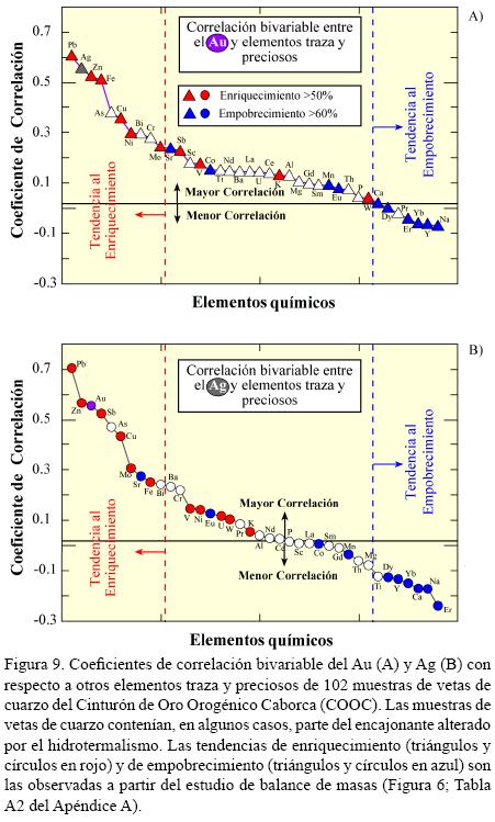 Los resultados del estudio de correlación geoquímica bivariable realizados sobre las vetas de cuarzo del COOC sugieren que los elementos que presentaron una mayor proporción de enriquecimiento en el análisis de balance de masas (Pb, Ag, Zn, Fe, Cu, Ni, Mo Sb y V) coinciden con los elementos de mayor coeficiente de correlación positiva (triángulos rojos). Por el contrario, los elementos que presentaron una mayor proporción de empobrecimiento (Ca, Y, Na, Yb, Mn y Dy; triángulos azules) coinciden con los elementos con coeficientes de correlación negativa o nula (Figura 9A). Sin embargo, existen excepciones con algunos elementos que no coinciden con este comportamiento, como son el W y K para el caso del enriquecimiento, y el Sr y Eu para el caso del empobrecimiento. Por su parte, este mismo agrupamiento general de enriquecimiento y empobrecimiento elemental con respecto al Au también se observa para el caso de la Ag (Figura 9B; Tabla A6 del Apéndice A). Esta observación explica que el análisis realizado sobre las vetas de cuarzo, en conjunto con los fragmentos de la roca encajonante alterada, apoyan el resultado del estudio de balance de masas de una manera consistente. Es importante destacar que lo que sugieren los resultados de este estudio es que existe una correlación en el comportamiento de los elementos y compuestos con el estudio de balance masas, inclusive sin considerar los grados de correlación geoquímica bivariable.