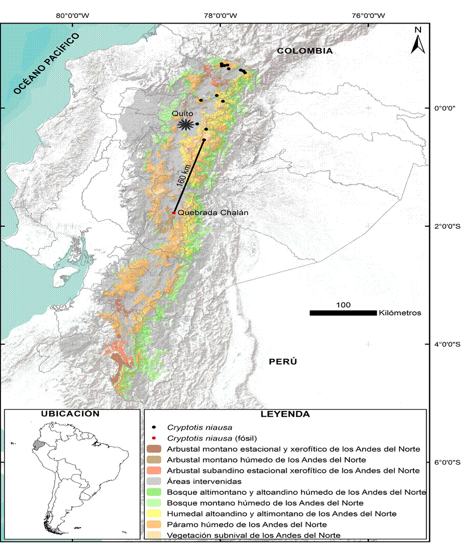 Figura 1 Ubicación del registro fósil de C. niausa (quebrada Chalán), junto a la distribución actual de esta especie en los ecosistemas de páramos andinos del norte y centro de Sudamérica (Josse et al., 2009). Se aprecia que en la actualidad Chalán se encuentra en un ecosistema de arbustales estacionales.