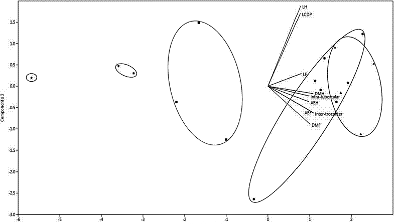 En el PCA, los componentes 1 y 2 explicaron el 79 % de la varianza. En el componente 1 se aprecian las dimensiones de ancho de los húmeros y fémures y en el componente 2 las principales medidas de longitud (Tabla 1).