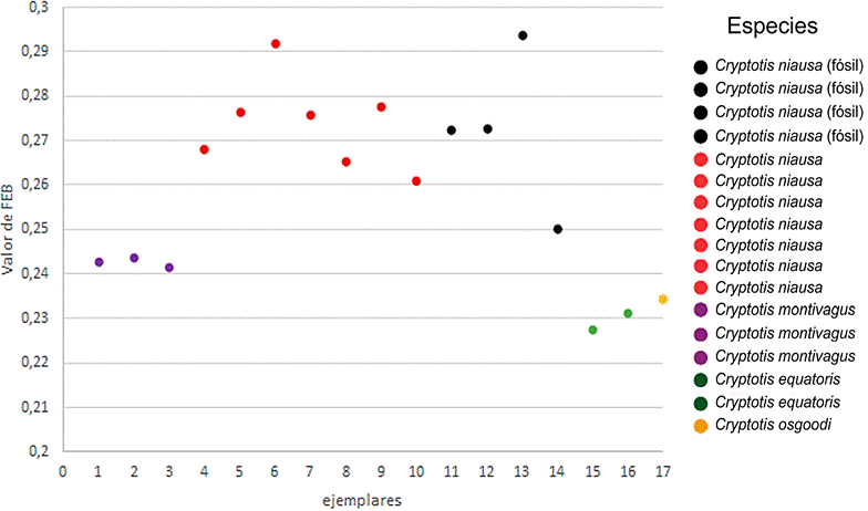 Las dimensiones de los restos fósiles de Cryptotis del sector de Chalán se sobreponen con las de C. niausa actuales. Sin embargo se nota que los fémures de C. niausa fósil son mayores en longitud total, ancho epicondilar, ancho inter-trocanter y diámetro medio del fémur (Figura 2). También se aprecia que los componentes principales de C. montivagus, C. equatoris y C. osgoodi no se sobreponen en las distribuciones; siendo C. osgoodi la especie con las menores dimensiones en los húmeros y fémures, mientras que C. niausa tiene mayores dimensiones en la longitud del húmero.