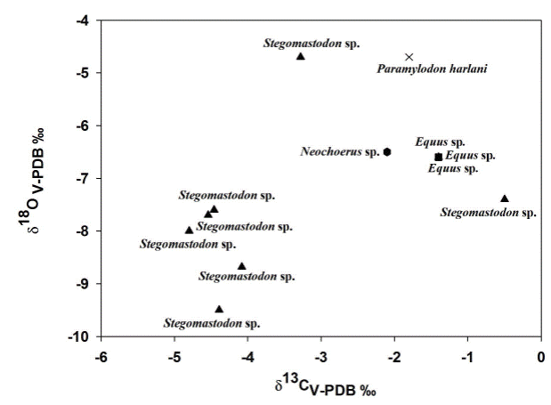 En la última localidad, se puede observar que en el caso de los caballos su promedio de δ13C es de -0.98‰, mientras que para la δ18O la media es de -7.0‰. Para los gonfoterios los valores promedio de δ13C y δ18O son de -4.2‰ y -7.7‰, respectivamente; en cambio las medias de δ13C y δ18O de los mamuts son de -1.8‰ y -6.1‰, respectivamente. El carpincho muestra valores isotópicos de carbono de -2.1‰ y de oxígeno de -6.5‰, mientras que el δ13C del perezoso terrestre es de -4.7‰ y de δ18O -6.5‰. El gráfico realizado con los valores de δ13C y δ18O muestra que la mayor parte de los gonfoterios forman un grupo, mientras el resto de las especies y un gonfoterio se distribuyen en la mitad del gráfico (Tabla 1, Figura 5).