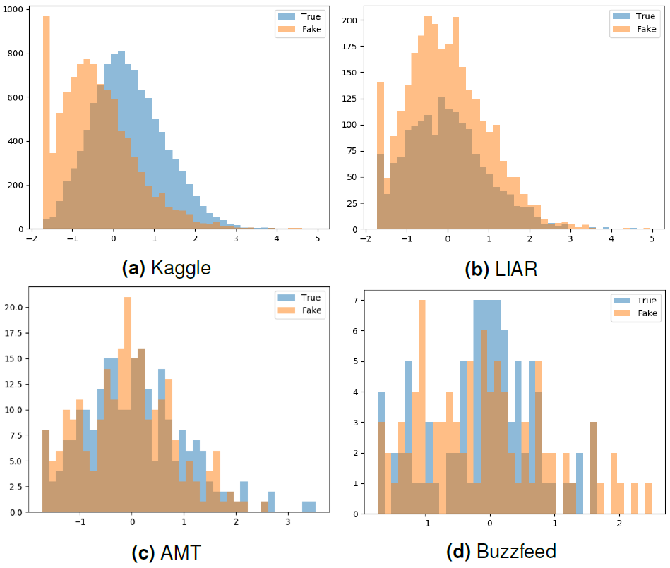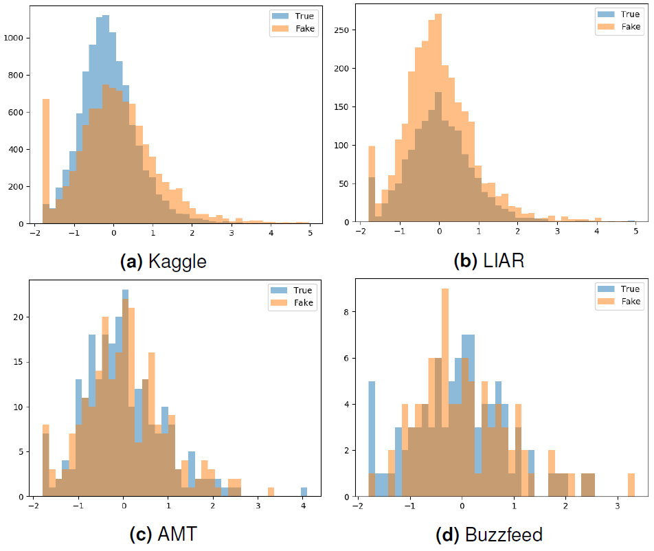 In the LIAR data, larger than AMT and Buzzfeed data, distribution of four features within fake news was similar to that within true news. No apparent patterns could be observed. Feature distributions in AMT and Buzzfeed data are similar, expectedly the amount of noise increases with decreasing size of the corpora.