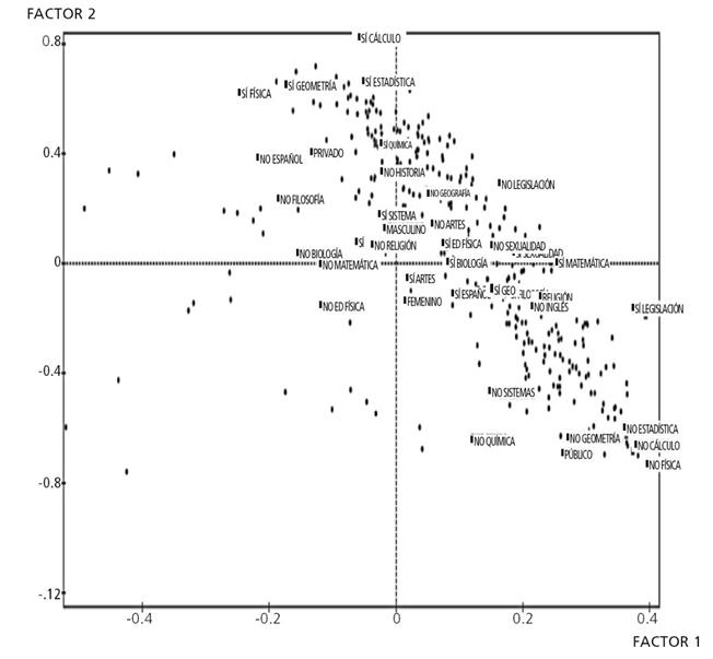 En el plano generado a partir del análisis factorial de correspondencia múltiple (AFCM), donde se suplementó el género y el tipo de institución, destacan los siguientes aspectos: a quienes les gusta Matemática, también les atrae Cálculo, Estadística, Física, Geometría, Química, y no les atrae Geografía, Filosofía, Historia y Legislación (Figura 3). Las mujeres se asocian dentro con el gusto por las Artes, Español y Biología. Los estudiantes del género masculino se relacionan más favorablemente con Matemática. Los de colegios públicos en general tienden a inclinarse negativamente hacia las áreas que conforman las matemáticas en general, caso contrario ocurre con los de instituciones privadas, cuyos estudiantes presentan mayor actitud positiva al área Matemática.