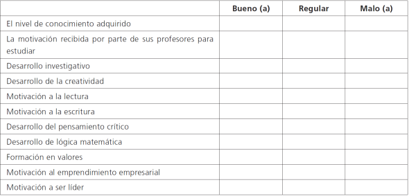 percepción sobre la motivación por la escritura, la formación en liderazgo y el desarrollo de la creatividad en su experiencia educativa.