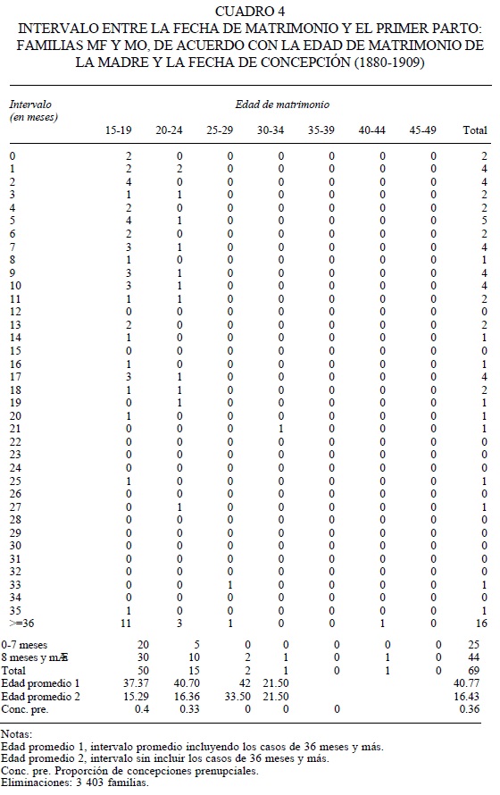 Cuadros 3 y 4. Intervalo entre la fecha de matrimonio y el nacimiento del primer hijo y concepciones prenupciales. El cuadro 3 corresponde a las mujeres que se casaron entre 1760 y 1789, mientras que el cuadro 4 corresponde a las mujeres que lo hicieron entre 1880 y 1909. Estos cuadros nos proporcionan el intervalo en meses entre fecha de matrimonio y primer parto, desglosado por grupo de edad de la novia. Se considera todo niño nacido en el periodo de cero a siete meses después de la fecha del matrimonio como concepción prenupcial. Como se puede observar, hay una notable diferencia en proporciones de concepciones prenupciales en los dos periodos considerados: 9 por ciento en 1760-1789 y 36 por ciento en 1880-1909. He tratado estos cambios en otro trabajo (Robichaux, 2000a y 2000b).