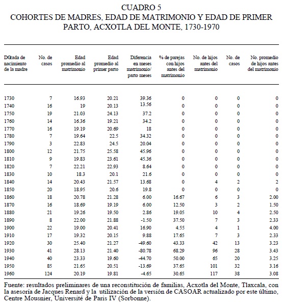 Cuadro 5. Edad de matrimonio y nacimiento del primer hijo. Cohortes de mujeres nacidas entre 1730 y 1970. Se trata de un cuadro sintético realizado a partir de los cálculos del conjunto de los cuadros, como los 3 y 4 anteriores. El cuadro muestra que se dio un cambio radical en las prácticas nupciales que inició con las cohortes de mujeres nacidas a partir de 1860, lo cual refuerza los datos que muestran los cuadros 3 y 4 (Robichaux, 2000a y 2000b).