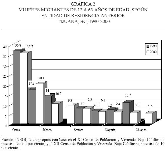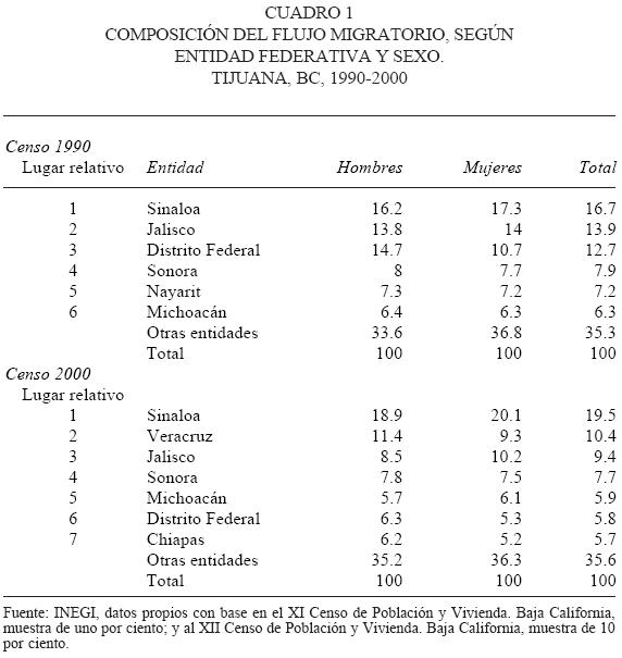 Mientras que en 1990, según su mayor porcentaje relativo, participaban con 64.7 por ciento del flujo total seis entidades federativas (Sinaloa, Jalisco, Distrito Federal, Sonora, Nayarit y Michoacán), en 2000 participaron con 64.4 por ciento del flujo migratorio siete entidades (Sinaloa, Veracruz, Jalisco, Sonora, Michoacán, Distrito Federal y Chiapas). Esto de por sí indica que el principal flujo migratorio hacia Tijuana se está diversificando. Pero, a la vez, vemos un efecto de desplazamiento entre entidades federativas en su orden de importancia según los porcentajes relativos: Sinaloa sigue ocupando el primer puesto, pero Veracruz desplaza a Jalisco, y el Distrito Federal pierde su importancia relativa en el total de los flujos a Tijuana, siendo desplazado a su vez por Michoacán. Por otra parte, llama la atención otra entidad que anteriormente no registraba un flujo sustantivo hacia Tijuana, como es el caso de Chiapas (cuadro 1).