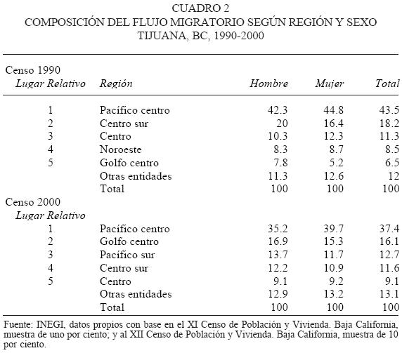 4 Esta región en el año 1990 ni siquiera figuraba dentro del flujo principal a Tijuana (cuadro 2).