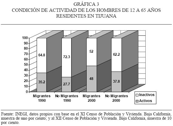 Los altos niveles de participación activa en el mercado laboral de los migrantes en Tijuana también responde a las características peculiares de esta ciudad fronteriza, ya que su estructura productiva presenta una mayor diversificación sectorial, posibilitando la inserción de la población no migrante en actividades no manufactureras, como el comercio y los servicios.