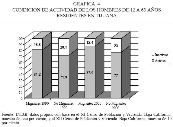 Según los resultados que hemos podido obtener para los años 1990 y 2000, en Tijuana se produjo un aumento generalizado en la participación económica.8 A pesar de que el crecimiento de la población económicamente activa (PEA) se verifica en toda la población en general, una parte importante de este crecimiento se debe a la incorporación de una fuerza laboral de origen migrante de ambos sexos, tal como se observa en las gráficas 3 y 4.