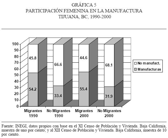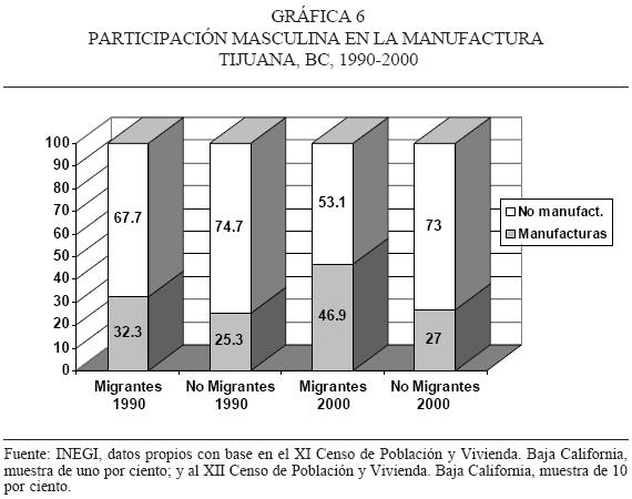 Si bien es cierto que los datos del censo no logran identificar directamente a las empresas maquiladoras, específicamente en el caso de Tijuana podemos considerar a la industria manufacturera como una aproximación a la industria maquiladora.9 De tal manera, y según lo que podemos observar en las gráficas 5 y 6, los hombres migrantes incrementan su participación en el sector de las manufacturas. Este fenómeno se puede relacionar de manera hipotética con la tendencia señalada en el aumento en la contratación de personal masculino registrada en la industria maquiladora.