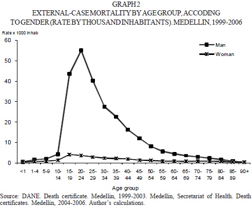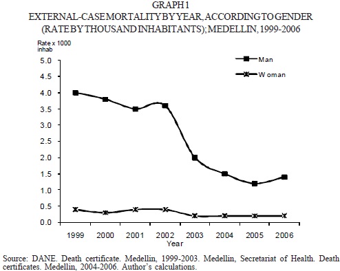 The gross average of mortality from external causes was of 1.3 per each hundred thousand inhabitants of the city, masculine population had an average rate of 2.5 per each thousand masculine inhabitants and the feminine population had a rate of 0.3 per each hundred thousand feminine inhabitants; this indicates that the risk of men to die from external causes in Medellin, between 1999 and 2006, was 9.3 times the risk that was calculated for women dying from these causes, according to the mortality of the study period.