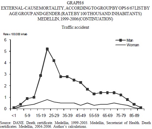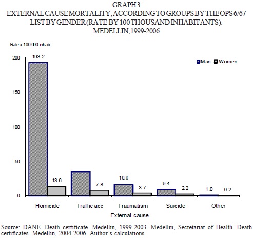 Mortality from external causes makes Medellin one of the municipalities with higher rates of death in the country until 2003 (Health Department, 2003), but from that date on, one notices a significant fall in the causes of death from extrinsic origin. In 2006, 736 deaths occurred due to aggressions (mortality rate of 70 per hundred thousand inhabitants) and 381 due to transport accidents, which constituted a rate of 36.2 per hundred thousand inhabitants (Health Department, 2006).
