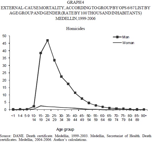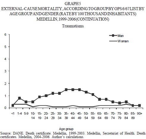As one can see in the characterization of the behavior of the mortality from external causes in Medellin, Colombia, between 1999 and 2006, according to age and basic cause, the main cause of death for almost all population groups were homicides, having as exception extreme groups (younger than 15 years and older than 60), where transit accidents and traumas caused by non-intentional falls or accidents had the first positions in the rank. These findings corroborate what has been explained by the Health Department in the report on the Health Situation of the Medellin Municipality, (Health Department, 2003), which found mortality from aggressions (homicides) as main cause of death between 1992 and 2001.