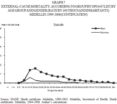 Suicide was the fourth external cause of death for the inhabitants in Medellin, mainly in the age group from 15 to 19 years, where there were 153 self-inflicted deceases that created an average rate of mortality of a decease per each hundred thousand inhabitants of the city, the second age group was that in the age between 20 to 24 years with a rate of 0.9. Suicides recorded in the study period were mostly in masculine population, mainly in the groups from 15 to 25 years, in the same way, suicides in the feminine population were mainly recorded in the same age groups. The recording of suicides in population younger than 15 is striking and despite the fact that both sexes record deceases due to this case, the highest risk is recorded in the masculine population in all the age groups, mainly in those between 75 and 79 years, where risk is 10 times higher than that of the feminine population of the same age group (graph 7).