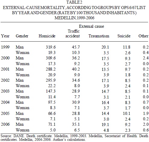 Mortality was analyzed having Medellin as the residence municipality of the deceased person, the death certificates recorded in the database corresponded to 96,748 people who died from 1999 and 2006, and from them, 22.9 percent (22,128) had as probable cause of death a violent cause, whose variations are grouped in the external causes of the OPS 6/67 list, group 5. These codes were grouped in: homicides (72.9 percent), transit accident (15.3 percent), accidental traumatisms (7.3 percent), suicides (4.2 percent) and other causes (0.4 percent). That is, from each four deceases from external causes, at least three were caused by aggressions (homicides), a piece of information that reflects the violence that the city experiences, but that has decreased in recent years.