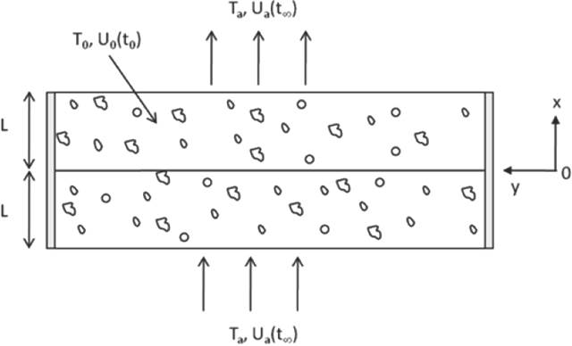 En la Figura 1 se muestra el esquema de un ladrillo representado por una placa plana que inicialmente se encuentra a una temperatura T0 y con un contenido de humedad U0. Posteriormente, la placa se coloca en un medio de secado convectivo, cuyas condiciones son Ua y Ta .