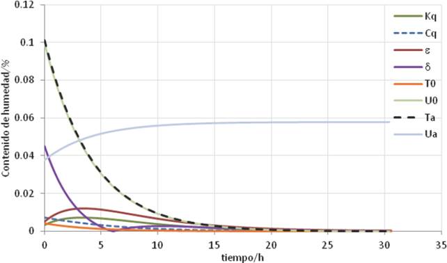 αq (c) es el coeficiente convectivo de transferencia de calor, que está acoplado con la transferencia de humedad en las condiciones de frontera; el incremento en 10% del valor de αq , redujo el tiempo de secado en 0.1 h. La contribución máxima de este coeficiente es de 0.2% de contenido de humedad.