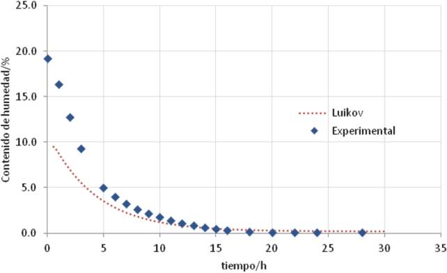 Los perfiles (teóricos y experimentales) de la Figura 4 muestran una diferencia en los perfiles en las primeras horas; sin embargo, en la región final del periodo de velocidad decreciente estos concuerdan satisfactoriamente.
