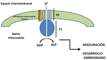 Figura 1 Esquema de la ATP sintasa o complejo V de la cadena respiratoria mitocondrial. Se muestran las subunidades F0 y F1 que la conforman, así como la ATPasa6, componente de F0. La formación de ATP por la ATP sintasa es un regulador de la maduración de ovocitos y el desarrollo embrionario (ver texto).