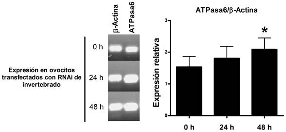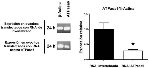 La Figura 3 muestra el efecto del RNAi para la ATPasa6 en ovocitos. La expresión de la ATPasa6 disminuyó 71% (habiendo asignado al valor densitométrico de ATPasa6 en el grupo control un valor de 1) a las 24 h, cuando se comparó con aquellos ovocitos que recibieron únicamente el RNAi de invertebrados (p<0.05 con t de Student).