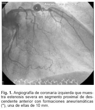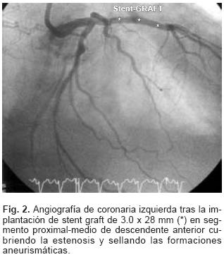 Presentamos el caso de un varón de 75 años, exfumador y EPOC, con infarto agudo de miocardio (IAM) anterior, fibrinolizado y con severo deterioro de la función sistólica. Se realizó coronariografía: la arteria descendente anterior presentaba estenosis severa proximal con formaciones aneurismáticas, una de ellas de 10 mm (Fig. 1). Se decidió tratamiento percutáneo y ante la posibilidad de perforación con stents convencionales se implantó stent graft de 3.0 x 28 mm (Fig. 2), cubriendo la estenosis y sellando los aneurismas, con buen resultado inicial y sin eventos coronarios a los 9 meses del procedimiento.