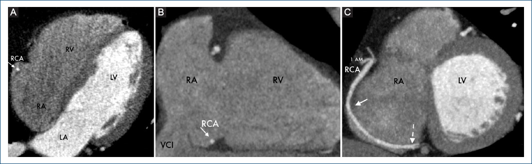 Figura 1 A: corte axial, vista cuatro cámaras. Se observa surco atrioventricular derecho vacío, coronaria derecha (corte transversal) con recorrido por dentro del atrio derecho, cercano a su margen agudo (flecha blanca). B: vista dos cámaras de cavidades derechas, segmento distal de coronaria derecha, continúa recorrido intracavitario, se observa contiguo a la pared inferior del atrio (flecha blanca). C: vista transversal del atrio derecho (modo máxima intensidad de proyección 3.8 mm), se observa el trayecto intracavitario completo, el ingreso (flecha blanca) y salida (flecha blanca discontinua). RCA: arteria coronaria derecha; RA: atrio derecho; RV: ventrículo derecho; LA: aurícula izquierda; LV: ventrículo izquierdo; 1AM: primera aguda marginal; VCI: vena cava inferior.
