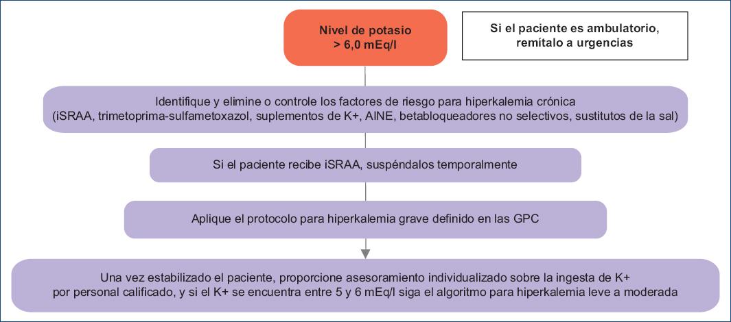 El manejo del paciente con hiperkalemia crónica debería involucrar diferentes especialidades, y a pesar de no existir un consenso universalmente aceptado sobre el tratamiento de la hiperkalemia crónica, se acepta que el control de los factores de riesgo (ERC, IC, DM, edad ≥ 65 años, iSRAA, AINE, otros fármacos que incrementan el K+ y una dieta rica en K+) es el primer paso, seguido de asesoría y apoyo sobre la ingesta de K+. En quienes esté indicado, se optimizará la terapia con iSRAA, se administrarán aglutinantes del K+ y se corregirá la acidosis metabólica. Es una práctica común, frente a una hiperkalemia, suspender o reducir la dosis de iSRAA, lo cual podría tener efectos en los desenlaces más importantes para el paciente (p. ej., aumento de la mortalidad). Por lo tanto, solo deberían ser temporalmente suspendidos en caso de episodios de hiperkalemia con repercusiones clínicas que amenacen la vida, y reiniciarlos prontamente una vez que el paciente alcance su nivel objetivo de K+.