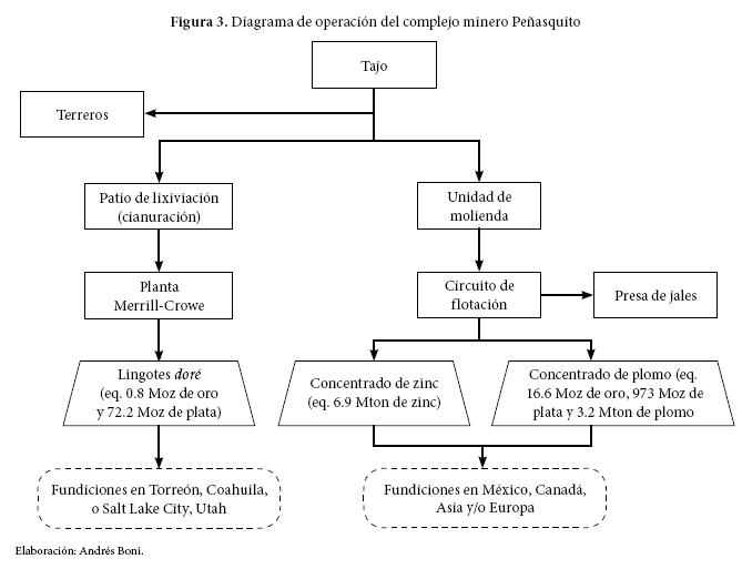 La distribución dispersa de los metales en el yacimiento Peñasquito resulta en "leyes bajas". En terminología minera, la "ley" de una roca es la cantidad de metal contenida por unidad de roca total expresada en gramos por tonelada. Por ello, la rentabilidad de un yacimiento de "baja ley" supone el procesamiento de un alto tonelaje de material. La explotación de un yacimiento en el que los metales están diseminados no es rentable mediante obras subterráneas, sino por profundas excavaciones desde la superficie minería de tajo a cielo abierto. Las siguientes cifras ilustran las cantidades de material involucradas en el Proyecto Peñasquito. El yacimiento contiene 1 191 millones de toneladas de roca mineralizada con leyes promedio de 0.45 g/ton de oro, 29 g/ton de plata, 3.2 kg/ton de plomo y 6.9 kg/ton de zinc. La geometría del yacimiento impone que se extraigan 3 135 millones de toneladas de roca estéril. De este modo, al cabo de casi 22 años de operación, se habrán extraído más de 4 300 millones de toneladas de roca, de las cuales menos de una tercera parte contiene minerales con valor económico. Lo más impresionante de todo este proceso es que de esos millones de toneladas de material procesado se obtendrán apenas 10.2 millones de toneladas de metal (Bryson et al., 2009).5