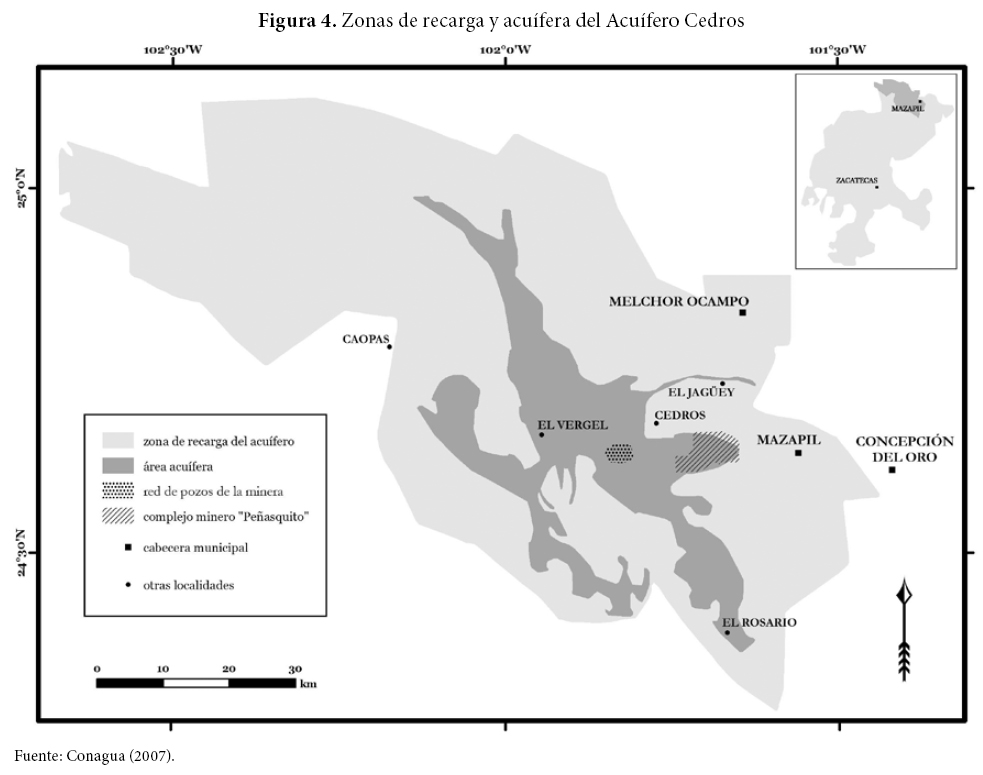 El valle de Mazapil es un territorio árido con una precipitación pluvial promedio de 324 mm/año (Conagua, 2007). La vegetación nativa se compone de cactus, huizaches y magueyes. En el valle, a pesar de su aridez, se desarrollaron desde el siglo XVI la agricultura y la ganadería, gracias al efecto de dos altas serranías que cierran el valle y condensan la poca humedad del ambiente. Esta humedad captada se infiltra y brota en manantiales que alimentan el río Grande, un cauce intermitente que fluye por el centro del valle a lo largo de dos o tres decenas de kilómetros hasta sumergirse en un bolsón en el que confluyen todas las aguas de la cuenca hidrológica. Si el clima fuera lluvioso, la planicie sería un lago; en cambio, por ser árido, se forma un acuífero subterráneo que almacena un importante, aunque finito, volumen de agua. En la figura 4 se ilustra la cuenca hidrológica de Mazapil llamada oficialmente "Acuífero Cedros" por la Comisión Nacional de Agua (Conagua) cuya superficie total es de 557 000 hectáreas (Conagua, 2007). El área en gris claro representa la cuenca de recarga del acuífero y el área en gris oscuro, el manto acuífero con una superficie de 90 900 hectáreas. En este mapa también se ubica la mina Peñasquito en la retícula del lado derecho y el área de la red de pozos que abastecen de agua al complejo minero en la retícula izquierda.