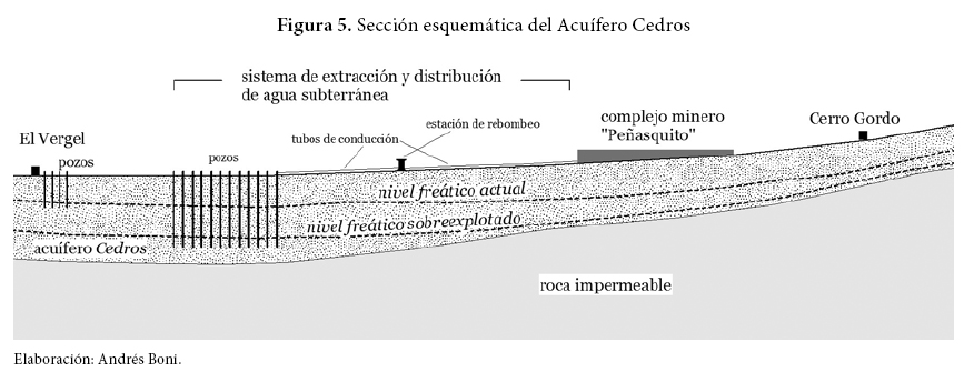 Para los campesinos del valle de Mazapil el abatimiento del manto freático ha hecho del agua un bien inaccesible primero en sus norias y manantiales, y luego en sus pozos profundos. Otro efecto pernicioso es el cierre de los poros en acuíferos granulares, como el de Cedros, que resulta en la disminución de la capacidad de almacenamiento de agua, así como en la subsidencia del terreno por compactación de las rocas y sedimentos (Margat, 1992). En la figura 5 se presenta un esquema de lo que sucede en el valle por la sobreexplotación del agua. Los 50 pozos de la minera, perforados a profundidades de 300 metros en el punto más bajo de la cuenca, abaten el nivel freático y dejan sin agua a norias de 30 metros y a pozos de 80 a 150 metros de profundidad de los ejidos de Cedros y El Vergel, ambos ubicados cuenca abajo del complejo minero. Como el abatimiento es generalizado, también cae el nivel freático cuenca arriba del complejo, lo que deseca norias y manantiales en afectación de agricultores de los ejidos de Cerro Gordo y Mazapil.